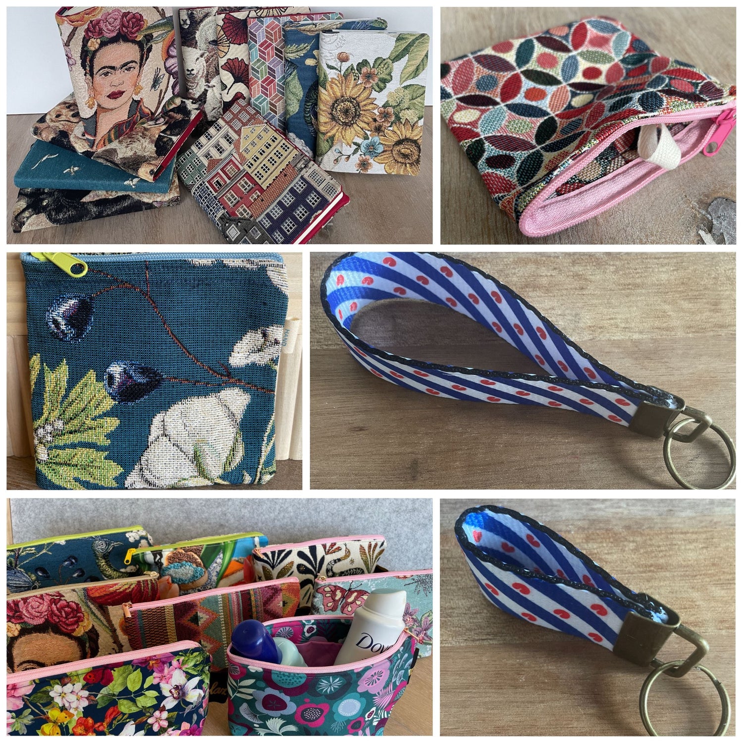 Prachtig handgemaakte accessoires zoals gekafte notitieboeken en agenda's, toilettasjes, handige beursjes, sleutelhangers...
