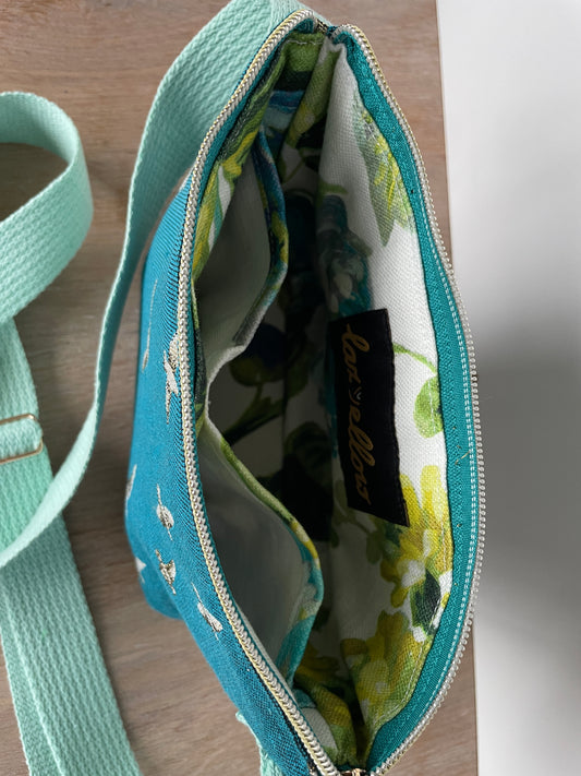 Handgemaakt Schoudertasje/cross-body Petrol met gouden vogels